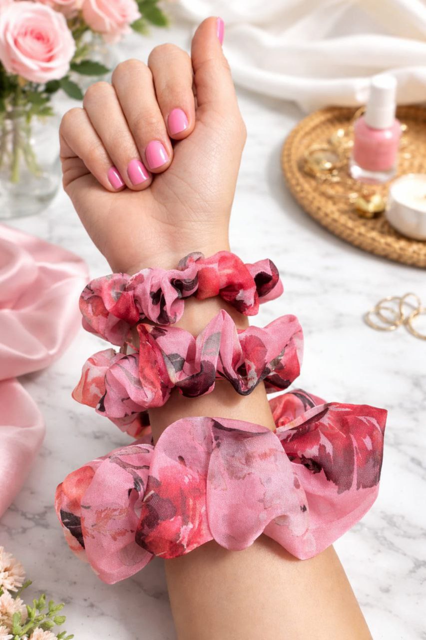 Cute Set of 3 Scrunchies in different sizes — Small, Medium & Large. Made with soft fabric for a comfortable hold without damaging hair. Perfect for daily use and styling different hairstyles.