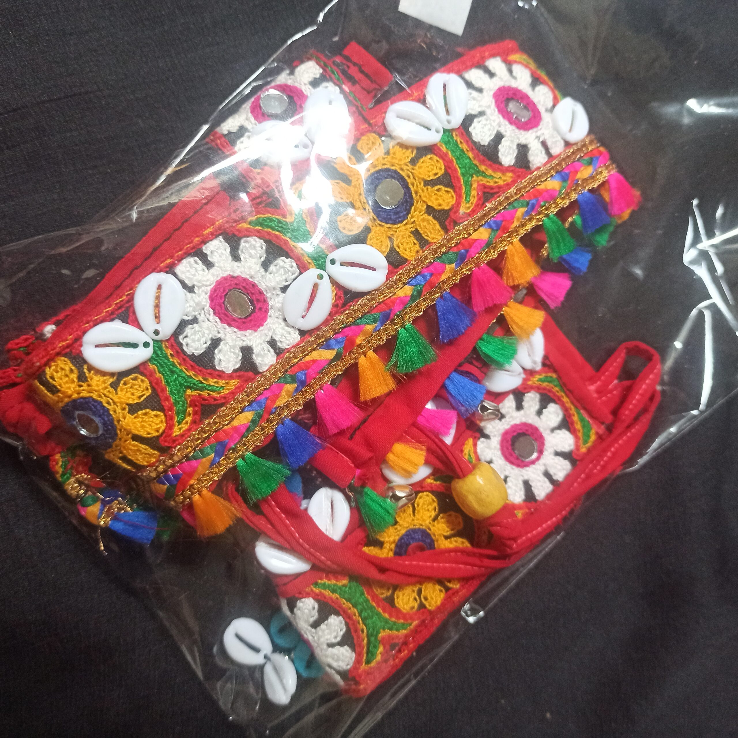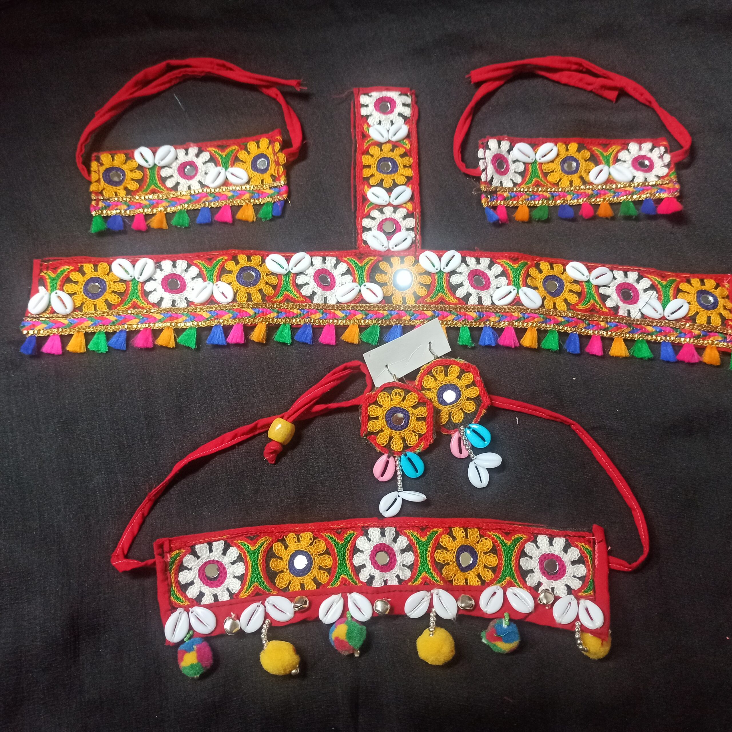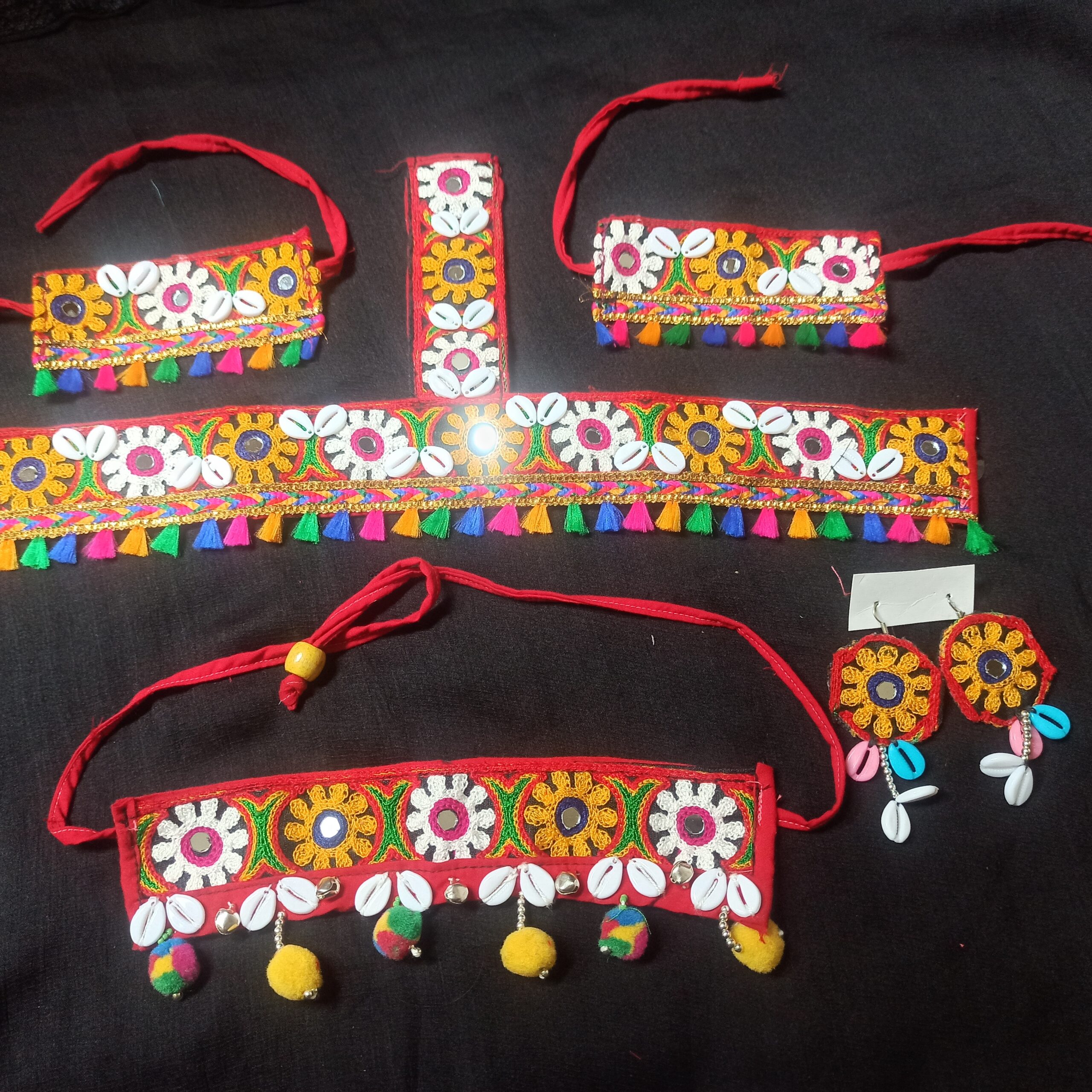 This jewelry set is ideal for Navratri, Garba nights, weddings, and festive occasions, adding a royal Gujarati touch to your ethnic attire. Vibrant threads, cowrie shells, and mirrors bring a colorful charm that enhances every traditional outfit.