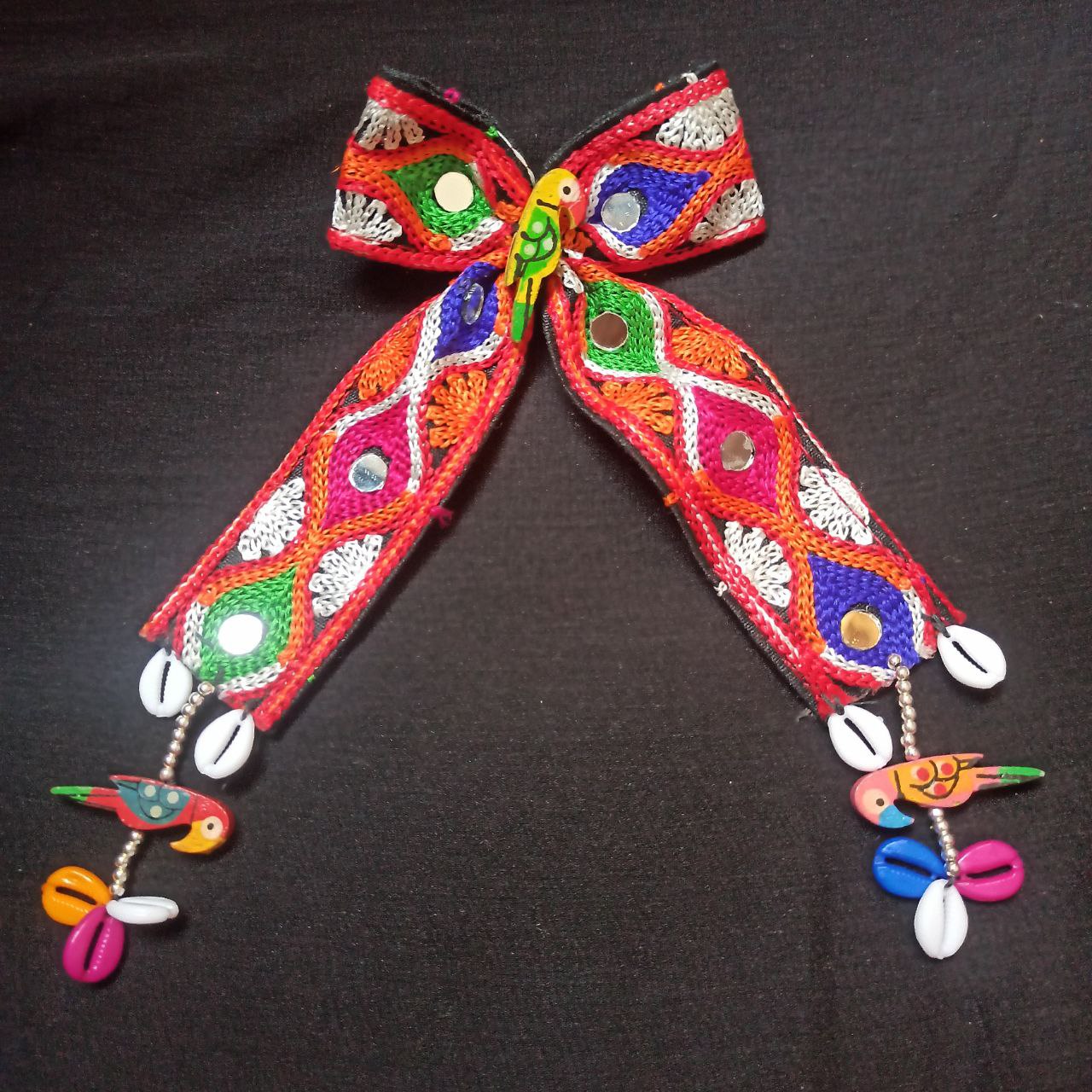 Bring charm and tradition to your look with our handmade embroidered hair bow, crafted with colorful thread embroidery, mirror work, and cowrie shell detailing.