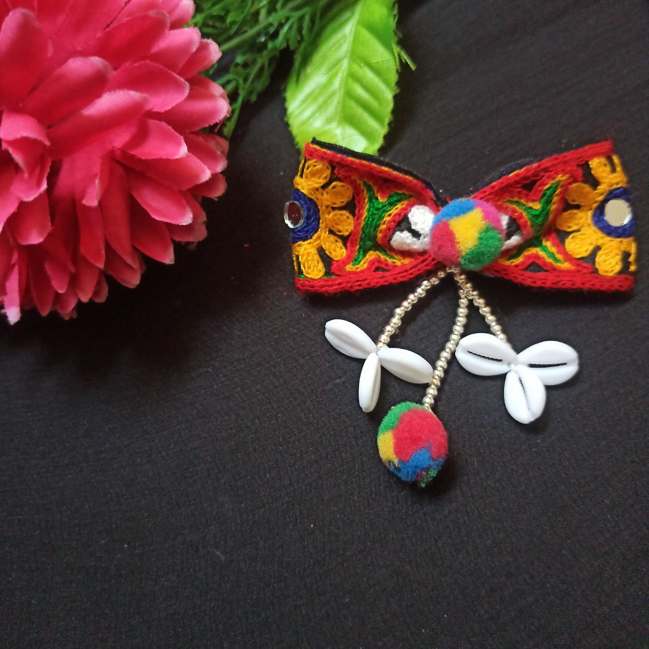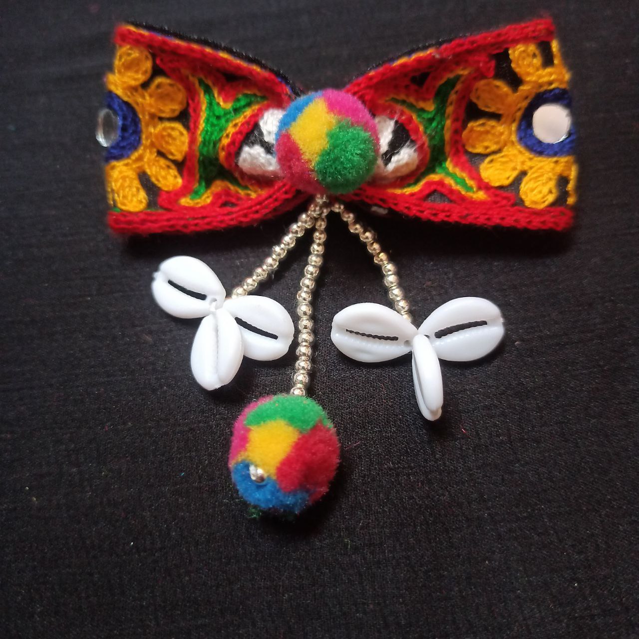 Add a touch of tradition and elegance to your hairstyle with this handmade ethnic hair bow. Designed with colorful embroidery, vibrant pom-poms, and cowrie shell embellishments, this hair accessory is perfect for festivals, weddings, parties, or daily styling.