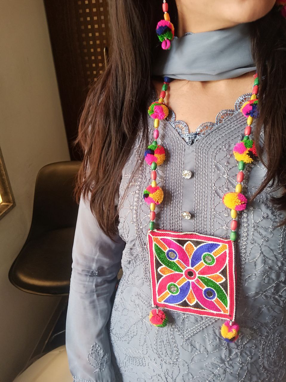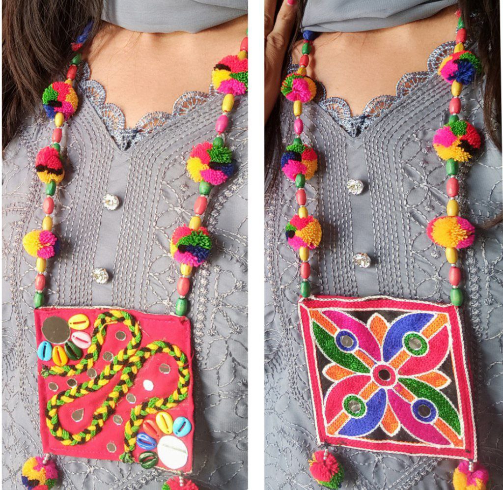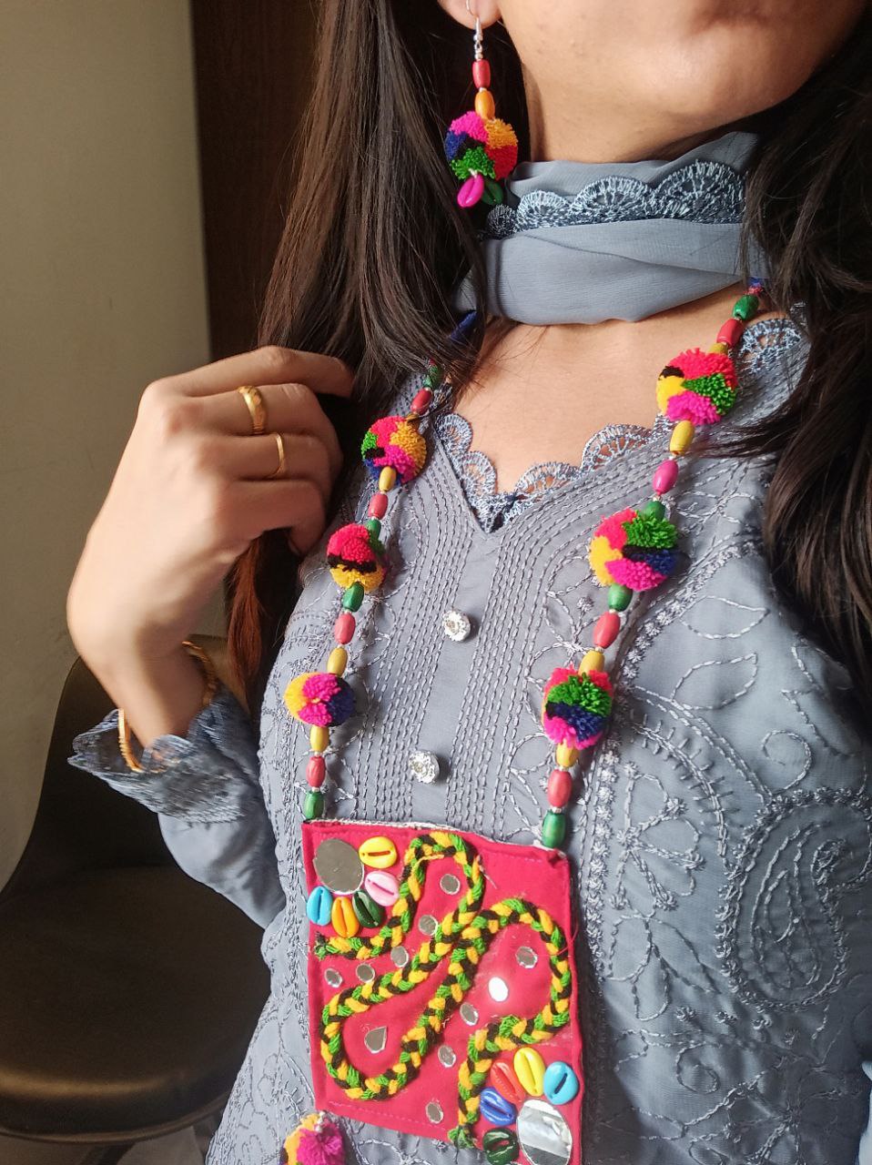“Exclusive handmade jewellery design necklace set crafted with mirror work, pom poms, cotton thread dori, kodi shells, moti & wool, along with embroidery patch detailing. Reversible design – can be worn from both sides.”