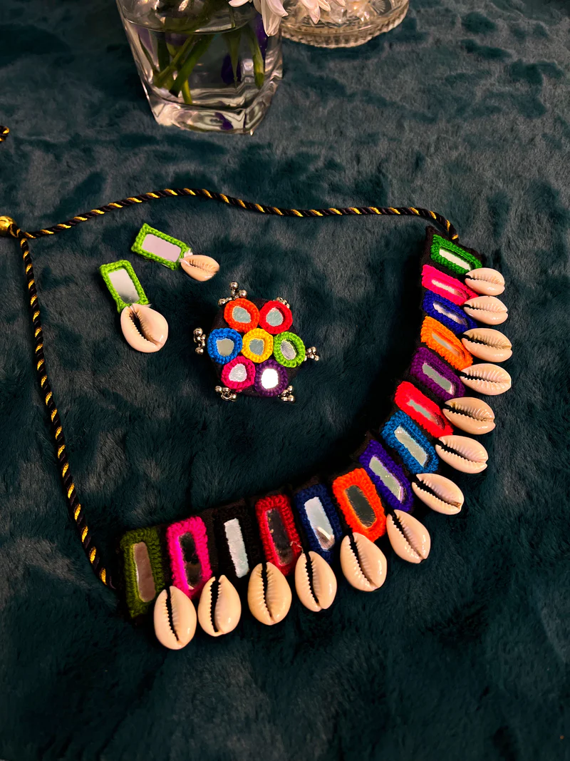 Make every occasion special with this exclusive necklace set combo. The set includes a handcrafted choker necklace, designed with mirror embellishments, natural kodi shells, and vibrant thread embroidery. To complete the look, the set comes with a multicolour adjustable ring, making it versatile and stylish for any festive outfit.
