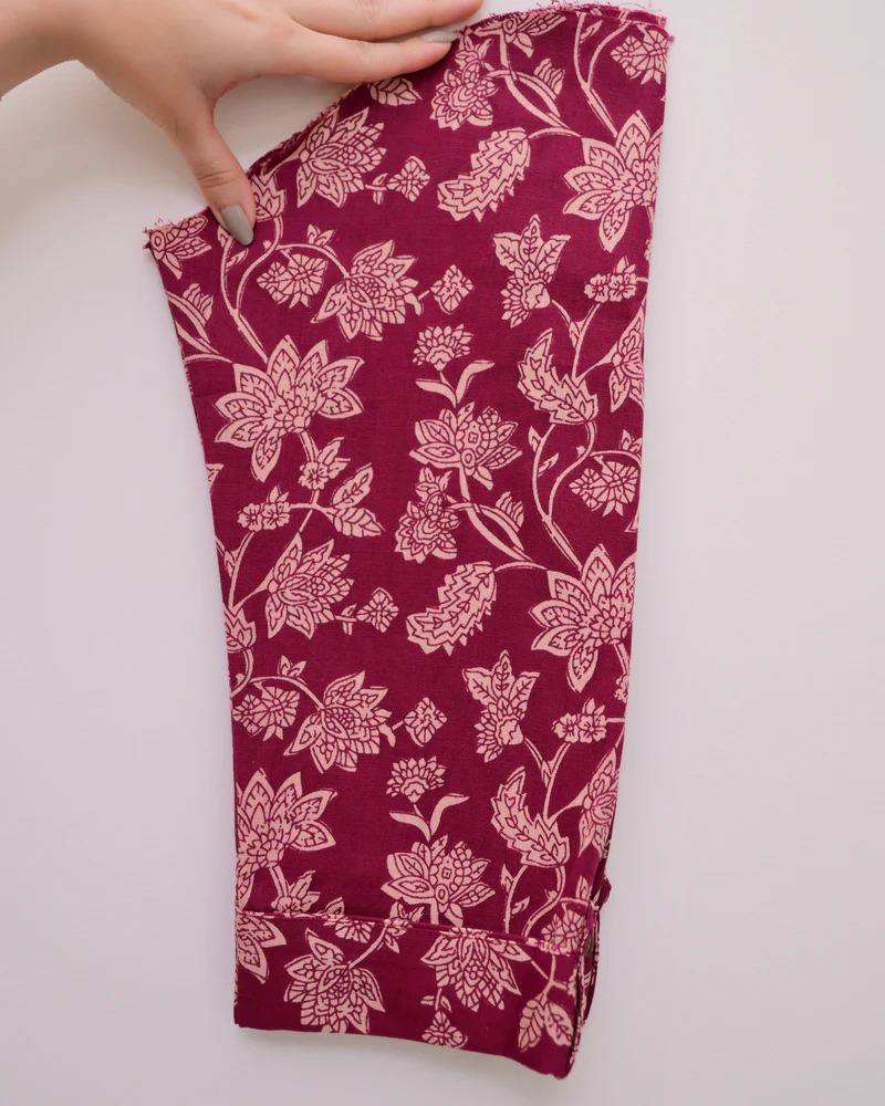 The light pink kurti is beautifully contrasted with dark pink and maroon floral digital prints, perfectly paired with white self-design bottoms featuring embroidery inspired by Chikankari work.